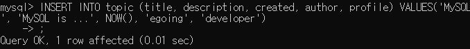 INSERT INTO topic (title, description, created, author, profile) VALUES('MySQL', 'MySQL is ...', NOW(), 'egoing', 'developer'); ★★ 많이 사용하는 명령