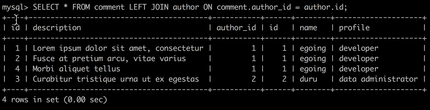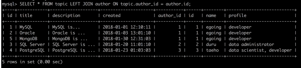 author_id 값과 author 테이블의 id 값이 같은 값들 끼리 같은 행에 두었다.