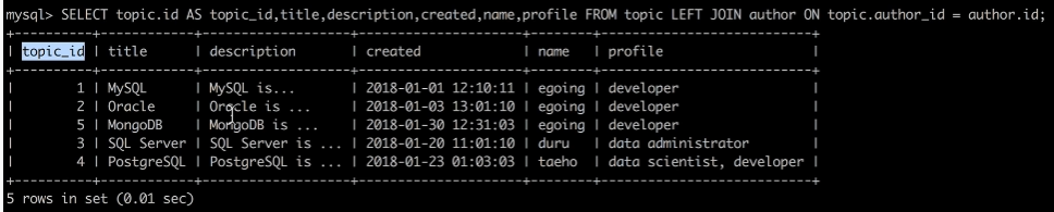 topic 테이블과 author 테이블을 결합한다.