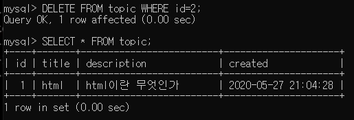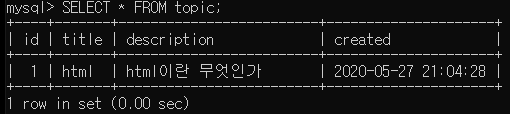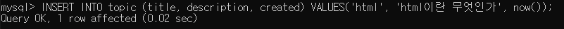 INSERT INTO topic (title, description, created) VALUES('html', 'html이란 무엇인가', now());