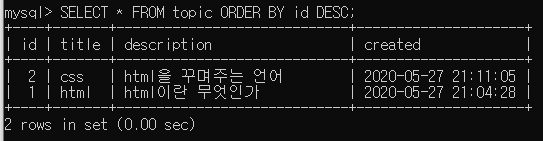 id, title, description, created는 데이터의 형식을 의미하는 열이다.