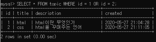 SELECT * FROM topic WHERE id = 1 OR id = 2;