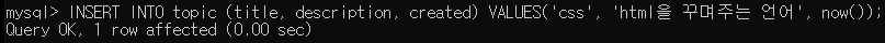INSERT INTO topic (title, description, created) VALUES('css', 'html을 꾸며주는 언어', now());
